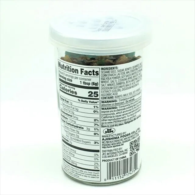 Sesame Seed, Sugar, Bonito, Seaweed, Salt, Cornstarch, Lactose, Maltodextrin, Potato, Egg Yolk Powder, Soy Sauce(Water, Soybean, Wheat, Salt), Cooking Wine, (Water, Rice, Salt, Wheat) Sorbitol, Beta-Carotene (Color), Disodium Succinate, Malic Acid, Annatto Extract (Color), Disodium Inosinate, Ascorbic Acid