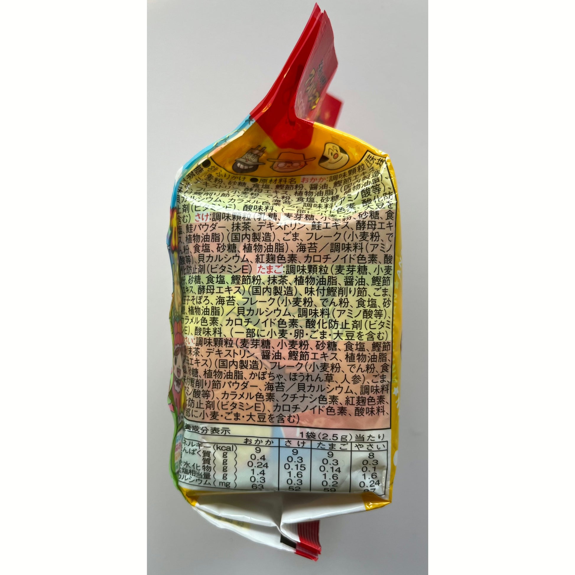 Okaka seasoning granules (wheat flour, sugar, salt, soy sauce, extract strain 15 Dextrin, yeast extract, vegetable oil), flakes (wheat flour, starch, salt, sugar, vegetable flavored dried shavings powder, seaweed, seasoning), salmon seasoning granules (lactose, maltose, flour, sugar, food powder, dextrin, extract, yeast extract, vegetable oil), sesame, flakes (wheat salt, sugar, vegetable oil), seaweed/seasoning, egg-flavored granules (maltose, wheat kiss, yeast extract), flavored dried shavings, order taste, salt, powder, green tea, vegetable oil, soy sauce, flakes (flour, starch, salt, vegetable oil), pumpkin, spinach powder, question granules (maltose, flour, sugar, salt, Matcha, dextrin, soy sauce, dried bonito extract, vegetable oil extract), flakes (flour, starch, vegetable oil, pumpkin, spinach powder, seaweed/shellfish calcium, acid), caramel pigment, gardenia color inhibitor, carotenoid coloring.