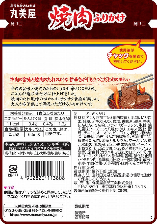 processed soybean product (domestic), lactose, roasted sesame, sugar, dextrin, salt, flavored oil, soy sauce, beef, carrot, Starch, fried garlic, beef tallow, yakiniku flavor seasoning, seaweed seasoning, extract (dried bonito, yeast, chicken, onion, beef), wheat flour, vegetable oil, spices, green onion, concentrated apple juice, processed chicken egg, vegetable protein, seaweed calcium, margarine, starch syrup, dairy products, high-fructose corn syrup, yeast, onion powder, glucose, starch syrup/seasonings (amino acids, etc.), colorings (caramel, red yeast rice, carotenoids), cellulose, glycerin, acidulant, Fragrances, antioxidants (vitamin E), spice extracts