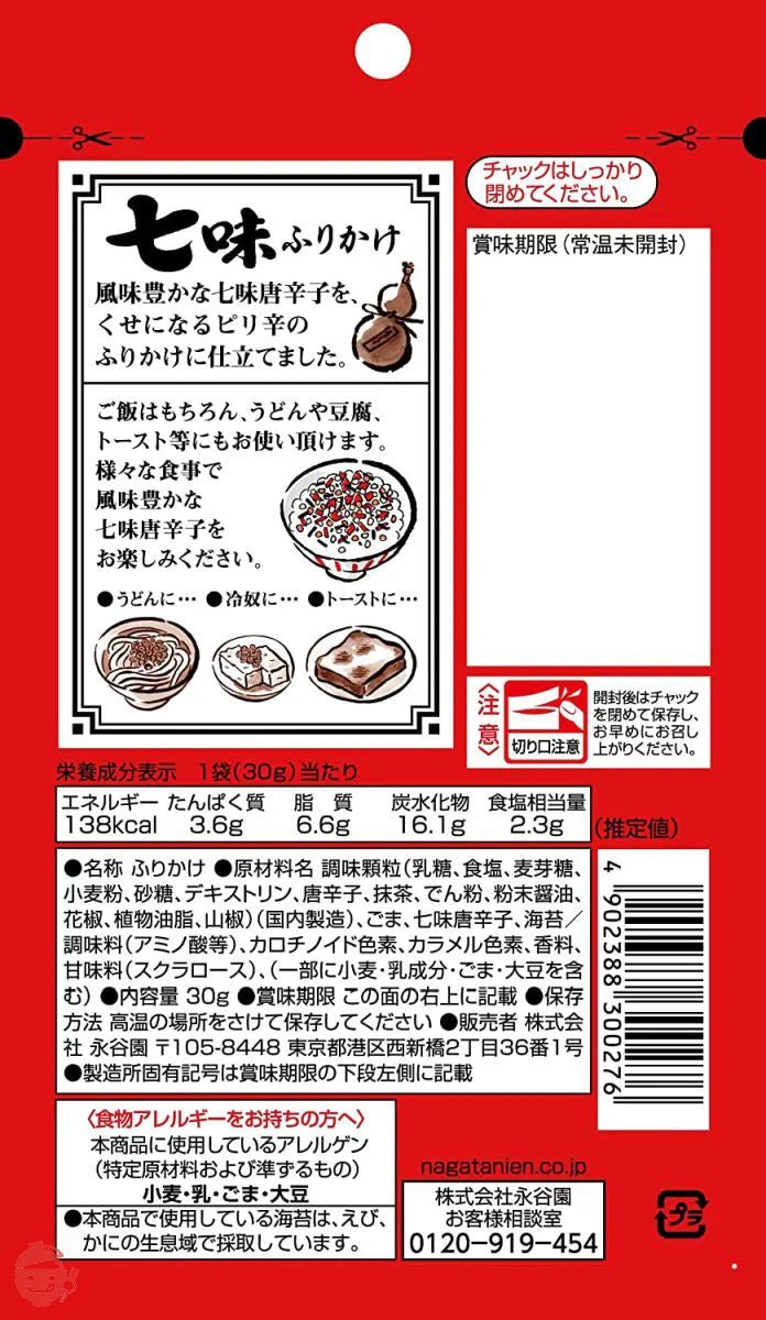 Nagatanien Japanese red pepper furikake with the flavorful kick and taste of Japanese shichimi red pepper. This furikake has a spicy taste and can be used with rice, udon, tofu, and even toast.