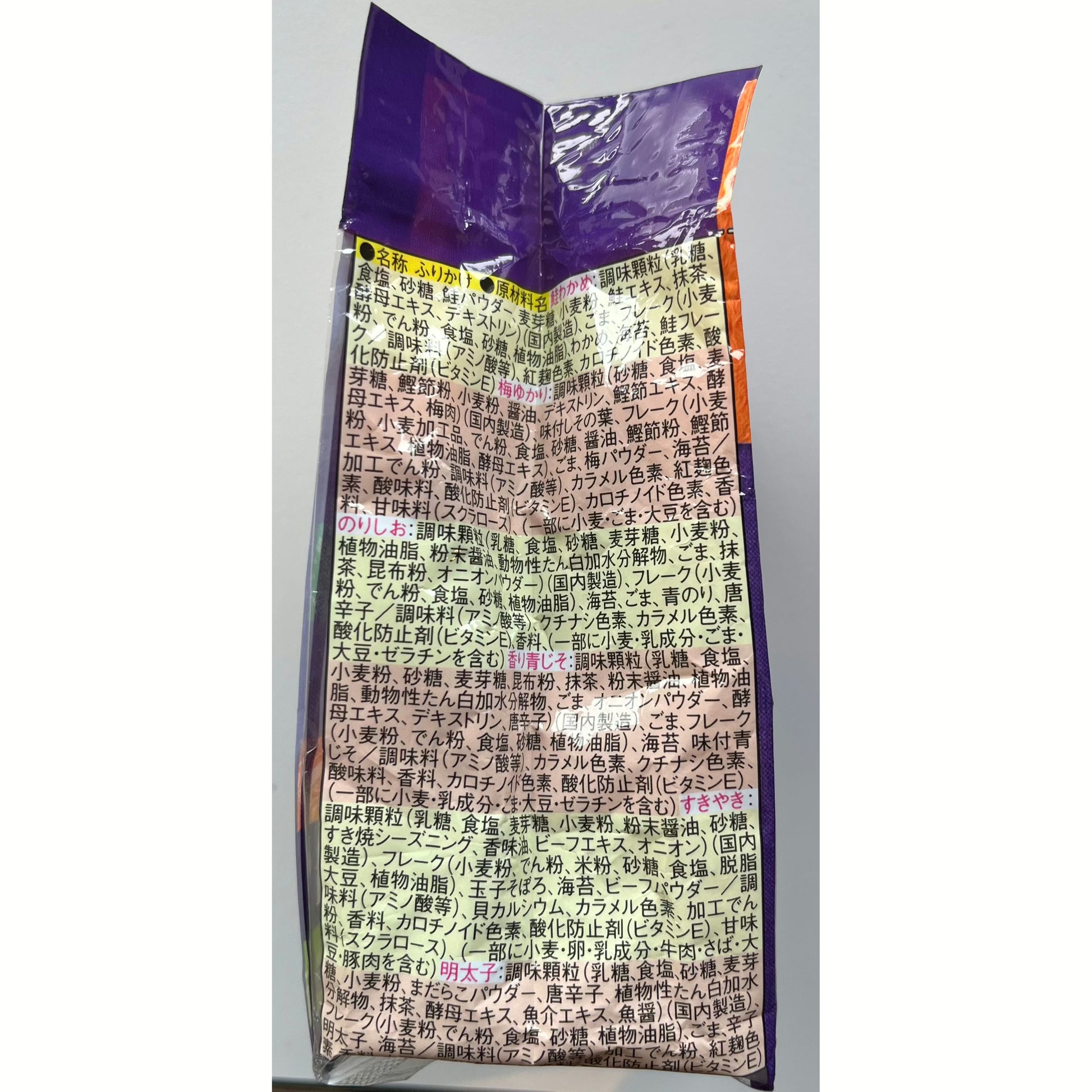 - Contains various flavors such as salmon, wakame seaweed, plum yukari, fragrant green perilla, sukiyaki, and mentaiko