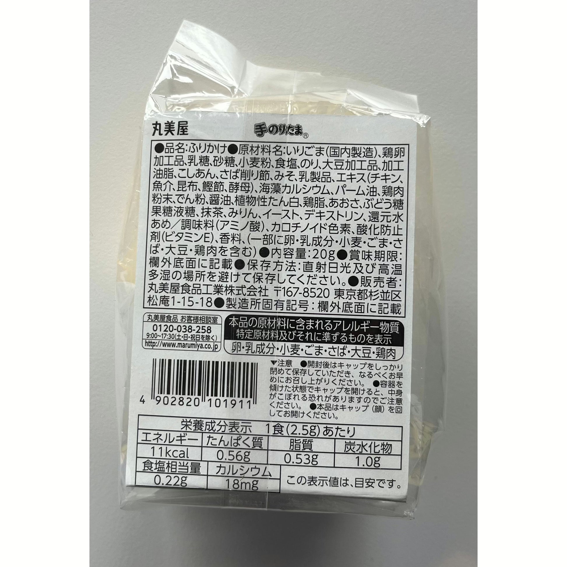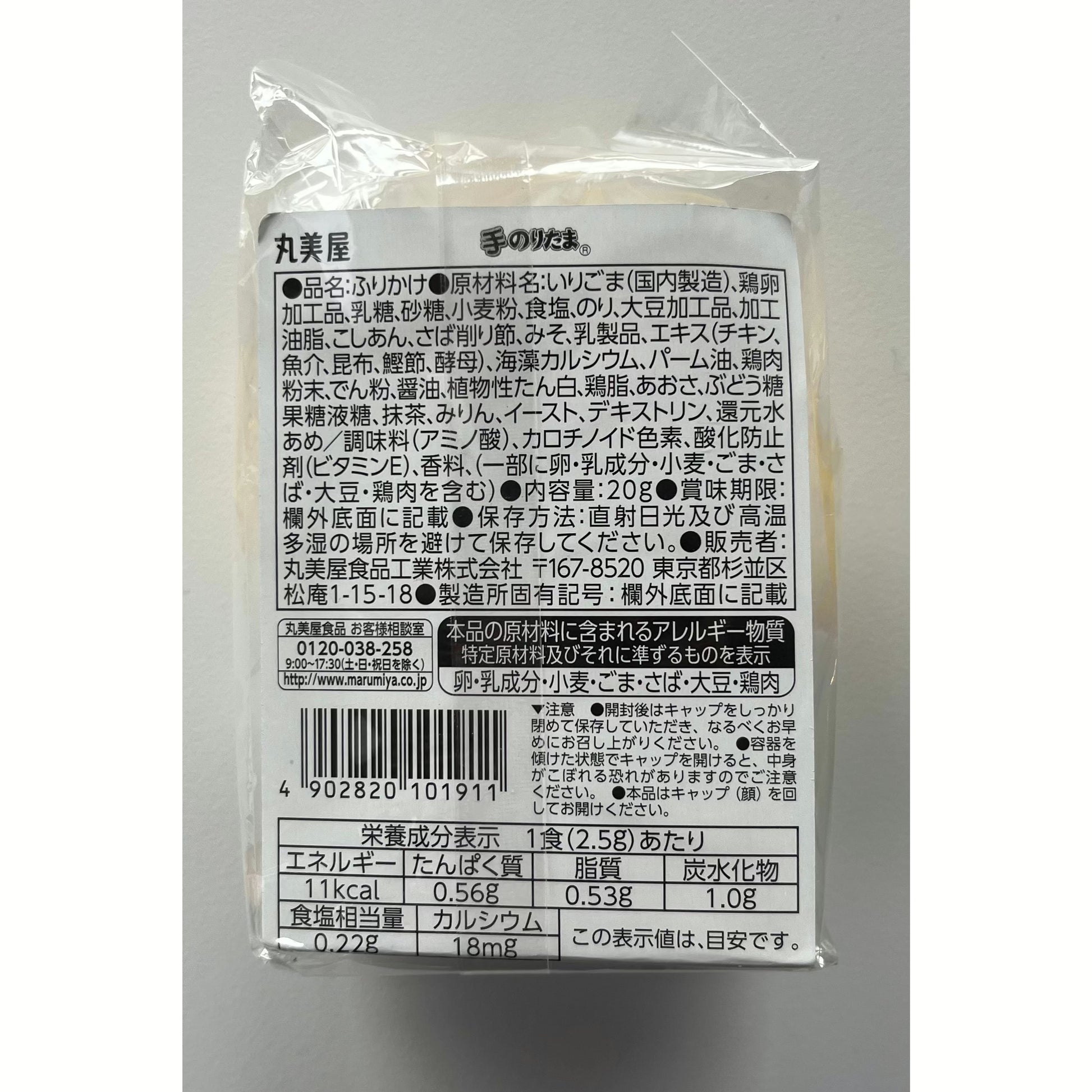 Roasted sesame (domestically produced), processed chicken eggs, lactose, sugar, wheat flour, salt, seaweed, processed soybean products, processed oils and fats, strained bean paste, shavings of mackerel, miso, dairy products, extract (chicken, seafood, kelp, dried bonito, yeast), seaweed calcium, palm oil, chicken powder, starch, soy sauce, vegetable protein, chicken fat, sea lettuce, glucose, fructose liquid sugar, matcha, mirin, yeast, dextrin, reduced water candy.