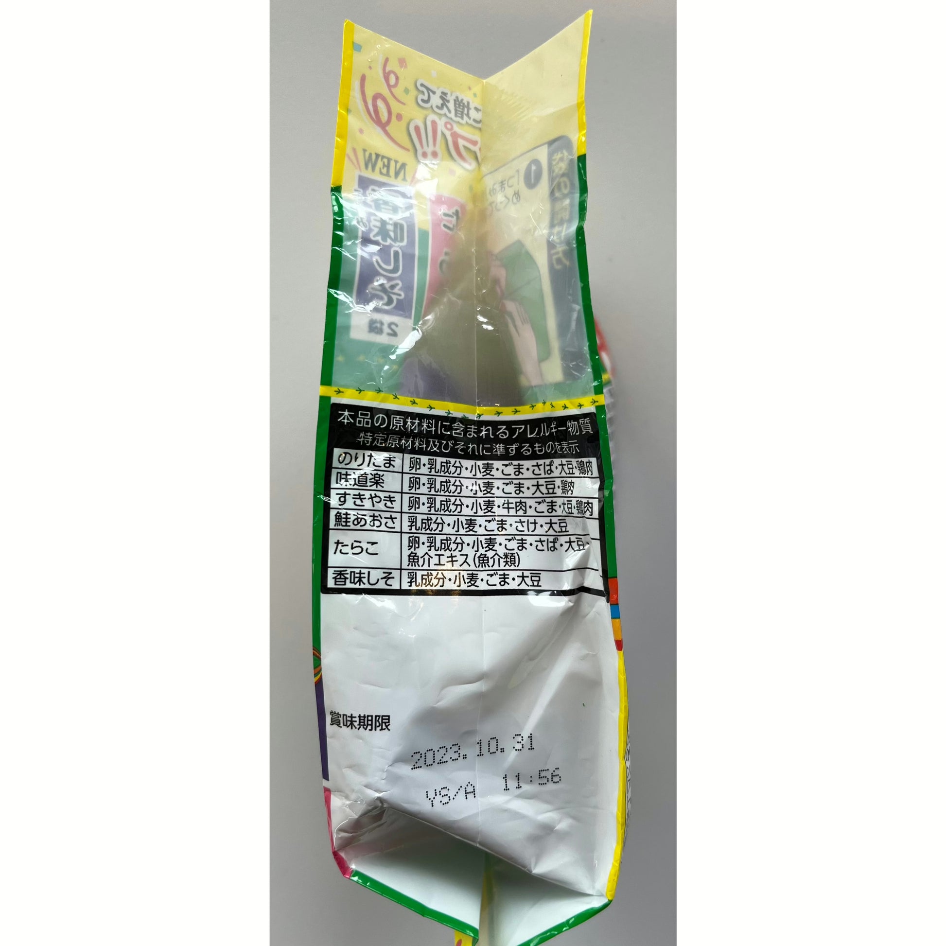 Nori Tamari Sesame (Domestic production, processed products, milk, sugar, flour, salt, seaweed, processed soybeans Processed, strained bean paste, shavings of mackerel, miso, dairy products, extracts (chicken, seafood, kelp, bonito flakes, yeast), seaweed calcium Cium, palm oil, chicken powder, starch, soy sauce, vegetable protein, chicken, seaweed, high-fructose corn syrup, matcha, miri Yeast, dextrin, reduced starch syrup / seasoning (amino acid), carotenoid pigment, antioxidant (vitamin PA , fragrance, (contains eggs, milk ingredients, wheat, sesame, mackerel, soybeans, and chicken in part) Boiled fish, sugar, salt, egg, seasoned seaweed, soy sauce, palm oil, wheat flour, mirin, rapeseed oil, starch, extract (boiled shavings, mother, chicken), processed soy products, seaweed calcium, vegetable protein, soybean oil, sea lettuce, dairy products, margarine, strainer Green tea, green laver, chicken, egg yolk oil, chicken sushi, high fructose liquid sugar, reduced starch syrup, yeast, lactose, dextrin, fragrance Oil/seasoning (amino acids), carotenoid pigments, antioxidants (vitamin E), flavorings, (some eggs, milk ingredients, necessary "Please pull up and down." Hold the part with your fingers, (including sesame, soybeans, and chicken) Sukiyaki] Flour (domestically produced), sugar, roasted sesame, soy sauce, salt, beef, processed egg strained bean paste, prepared lard, lactose, starch, beef tallow, vegetable protein, palm oil, margarine, sea lucium, onion Ginger powder, dairy products, extracts (yeast, beef, chicken), processed soy products, high-fructose corn syrup, mirin kistrin, Flavored oil, yeast, seasoned seaweed, sukiyaki seasoning, miso, spices, chicken powder, water Seasonings (amino acids, etc.), colorings (red beets, caramel, monascus, carotenoids, cellulose inhibitors) (vitamin E, rosemary extract), fragrance, spice extract, (including meat) [Sea lettuce] Roasted sesame (domestically produced), lactose, salt, sugar, vegetable protein, processed oil, sea lettuce, Kezuribushi, wheat flour, processed soybean products, seaweed, seaweed calcium, dairy products, soy sauce, matcha, mirin, starch, extract yeast), high fructose liquid sugar, yeast, reduced starch syrup, dextrin/seasoning (amino acids, etc.), coloring (carochi noid, monascus), antioxidant (vitamin E), flavoring, (contains milk ingredients, wheat, sesame, salmon, and soybeans) "cod roe" Cod roe (US, Iceland), bread crumbs, lactose, salt, roasted sesame, processed soybeans, sugar, shortening, Seaweed, mackerel shavings, palm oil, seafood extract (seafood), krill extract, starch, white powder, soy sauce, dextrin seaweed calcium, reduced starch syrup, yeast extract, starch syrup, fructose-glucose liquid sugar, mirin, dried bonito extract/seasoning (amino acids, etc.), coloring agents (monascus, carotenoids), swelling agents, antioxidants (vitamin E, rosemary extract) (Contains eggs, milk ingredients, wheat, sesame, mackerel, soybeans, seafood extract (fish and shellfish) in part) Flavored shiso) Milk (made in the United States) [made], perilla, salt, roasted sesame, sugar paste, dried bonito, wheat flour, reduced starch syrup, grapes, soy sauce Dextrin, processed oil, oligosaccharide, plum sea calcium, extracts (yeast, mirin, dairy products, grapes) Yeast/seasoning (amino acids, etc.), acidulant, coloring (red beet, anthocyanin, carotenoid de), fragrance, antioxidant (vitamin E), thickener (xanthan), (partially contains milk ingredients, wheat, sesame, soybeans)